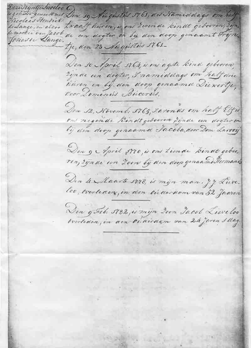 Daartoe schreef zij eigenhandig vlak voor het trouwen de opsomming van haar familie en overhandigde dat stuk aan de familie de Lange die het tot op heden in hun archieven in Alkmaar bewaart hebben.
